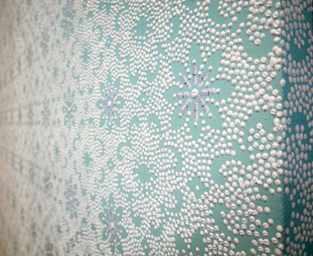 一次生病,把药丸放在桌布上,回来时找不到想要服用的药片,找了很久发现药片隐藏在花布中。药丸放在花布上的“消失”会给人一种不经意的错觉。远看和近看形成了陌生感、距离感和尴尬感。在绘制上,自己从非绘画入手,放弃了传统绘画的造型和笔触,把雕塑的“塑”用于绘画的“绘”中,药片成了颗颗的凸起状和冰冷状。