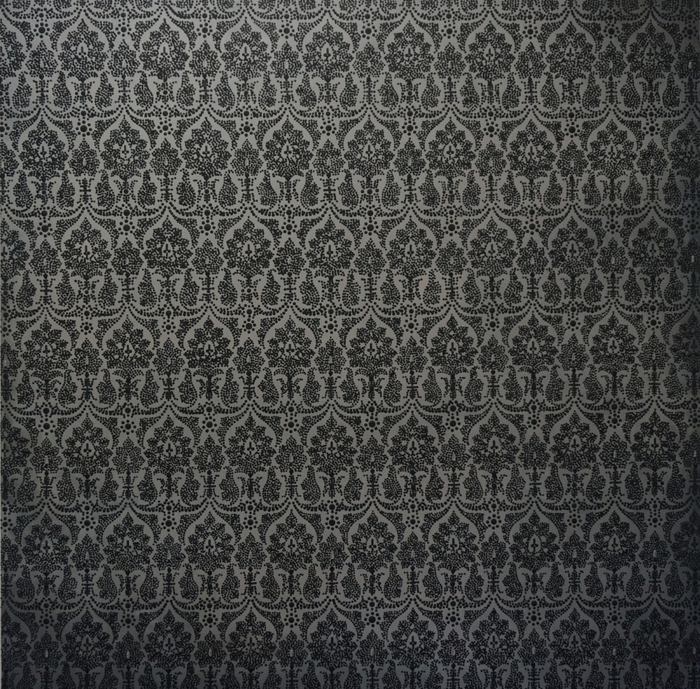 一次生病,把药丸放在桌布上,回来时找不到想要服用的药片,找了很久发现药片隐藏在花布中。药丸放在花布上的“消失”会给人一种不经意的错觉。远看和近看形成了陌生感、距离感和尴尬感。在绘制上,自己从非绘画入手,放弃了传统绘画的造型和笔触,把雕塑的“塑”用于绘画的“绘”中,药片成了颗颗的凸起状和冰冷状。
